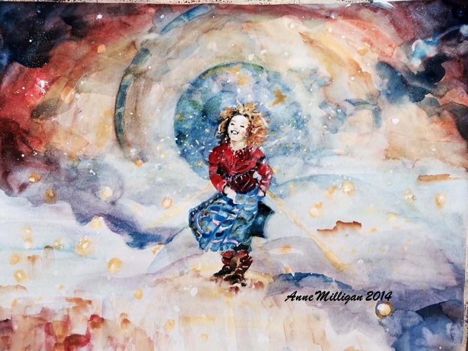 In this watercolor painting, ("Dancing with the Stars"), I wanted to convey the brilliance of our BEING, how we dance in a cosmic adventure here on our planet, and how everything dances and sings.