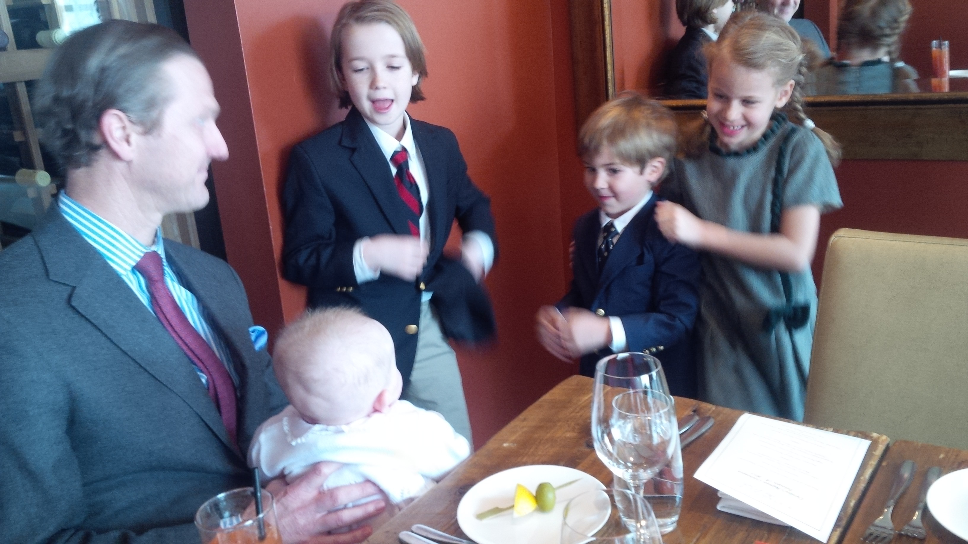 Last Sunday, my youngest granddaughter was Christened amid the snowy world of Boston. Beforehand she sat in my son's lap gazing at her brother & my daughter's son & daughter.