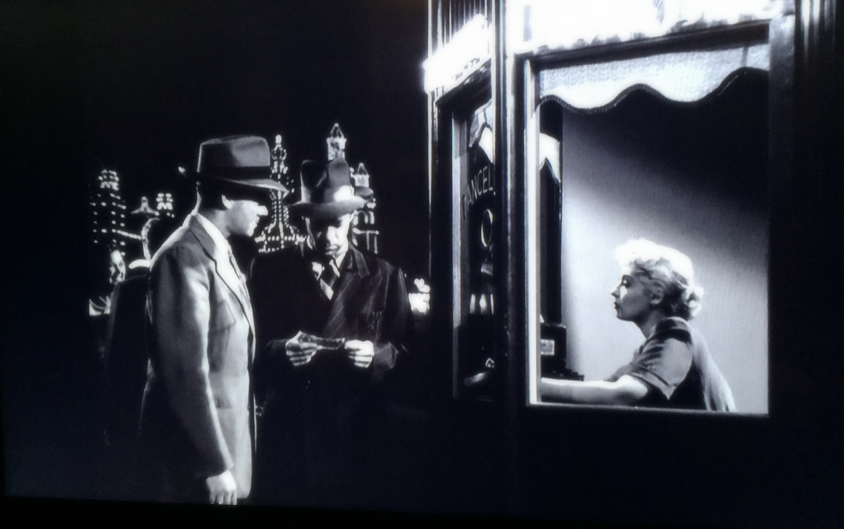 In movies since then I have often found myself noticing those barely seen people. Some seem like set pieces instead of human beings. Consider the woman & two men in the scene I photographed from the 1950 film noir classic "Gun Crazy"(screenplay by the great, wrongly-blacklisted writer Dalton Trumbo.) This picture is beautiful to me. The ticket taker (not in the credits) looks as lonely as a subject in an Edward Hopper painting (notice the shadow slanting above her head.) Moments & people like these evaporate into the ether unnoticed by the millions who saw them on a silver screen for a few seconds.