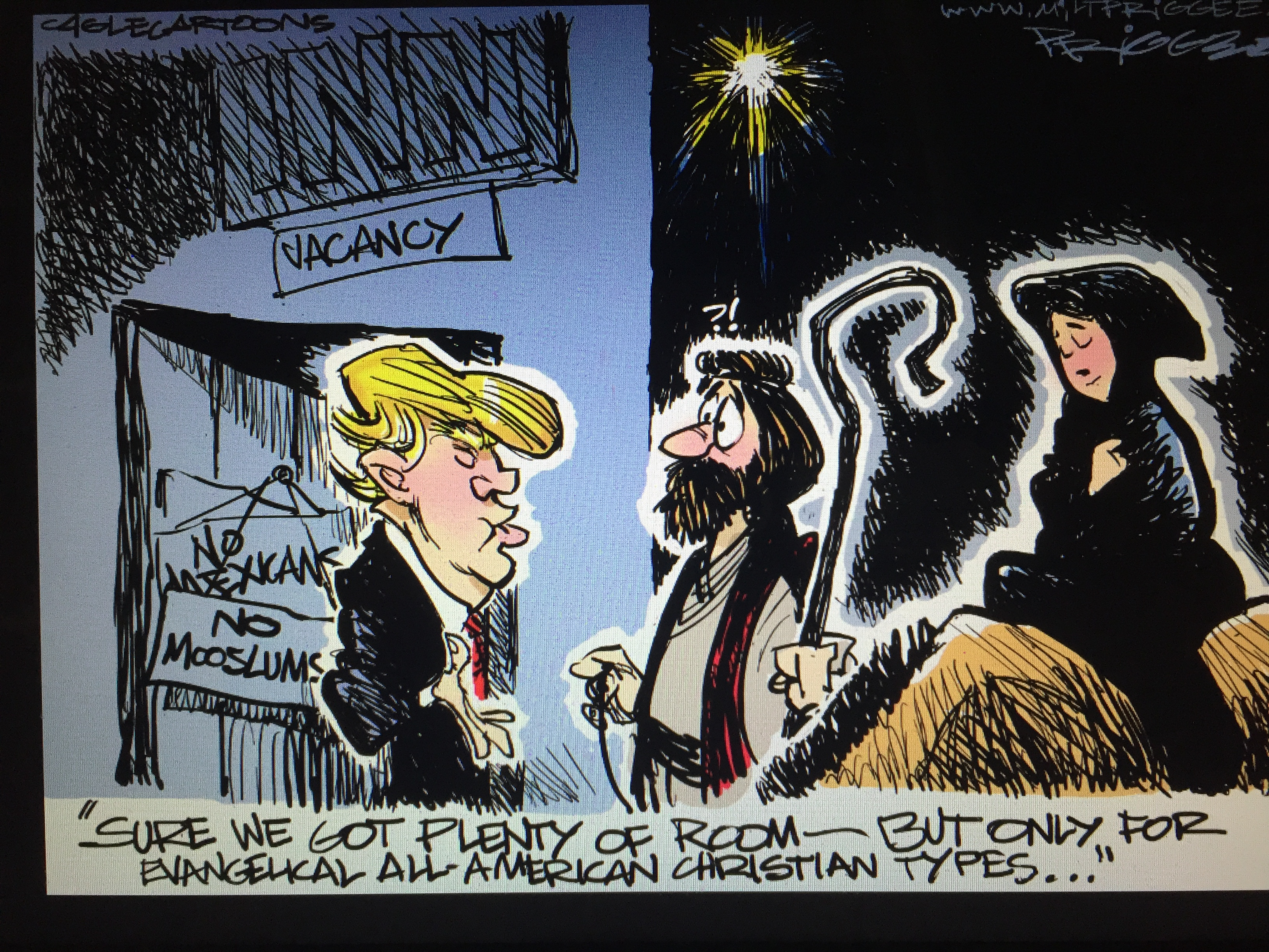 Cartoonists, along with thousands of other responsible commentators, have struggled to warn us. My best friend, attorney & author Bill Banta, is guiding a course on the Trump issue at his Presbyterian church in an effort to create further dialogue on this subject in a Christian context.