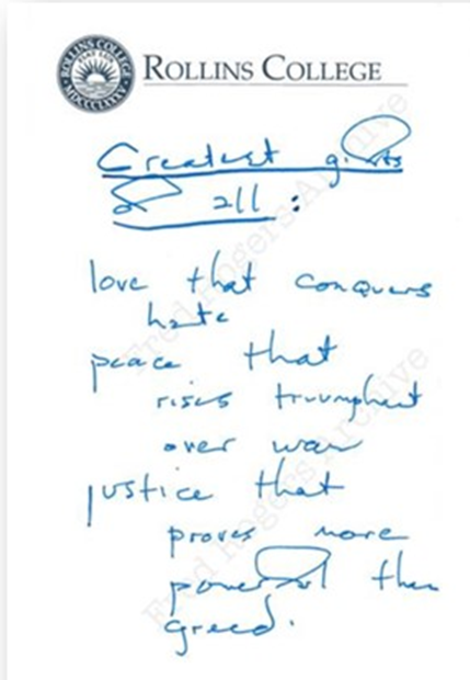 In the final draft, he penned these words ( photo) on this little note to expand upon the meaning of his familiar neighborhood songs, “It’s You I Like” and “It’s a Beautiful Day in the Neighborhood.”