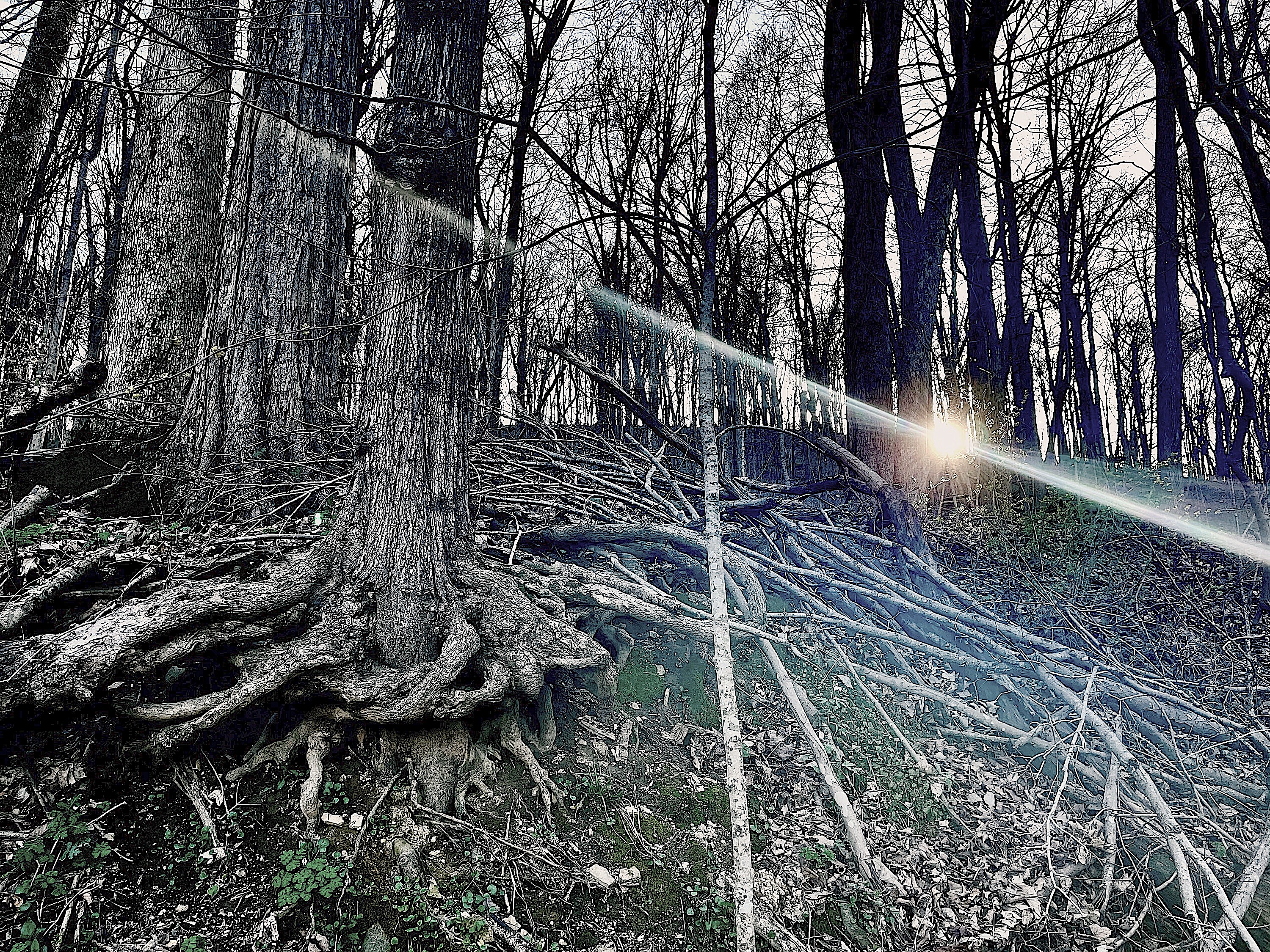 Minton's eye catches Beauty in the crosshairs of a shaft of sunset bisecting not only the slender oak in the foreground but the triplet of adult trees, thick & somber overseers of their slender child.