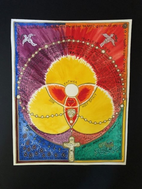 It wasn’t until after Helen passed that I truly realized who she was in my life. She was the embodiment of Christ in my life. She did not live for herself but for others. The mandala I drew represennt the trinityand has the rosary in it as Helen liked to pray. I too have found the rosary a comfort and a meditative process that I return to from time to time.