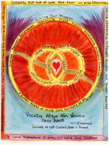 IMG_SacredWork2007Erie explained, “The touch card would be placed on or near the door of each patient room. Upon approaching a room, each caregiver would be encouraged to touch the card before entering, like a knock on the door of the soul, a reminder of the sacred humanity of the person in the bed. It's a small thing, and it can be transformative. Because it sends a signal throughout the hospital or any ministry that uses the touch card: the other person has holiness within. Respect this holiness.” Erie Chapman