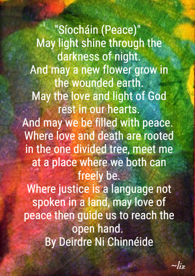 Síocháin-PeaceWhen I reflected upon what I might offer for this Labor Day weekend, my hope is that you might find some respite from all your toil. This is for all caregivers… for you are in my heart and in my prayers.